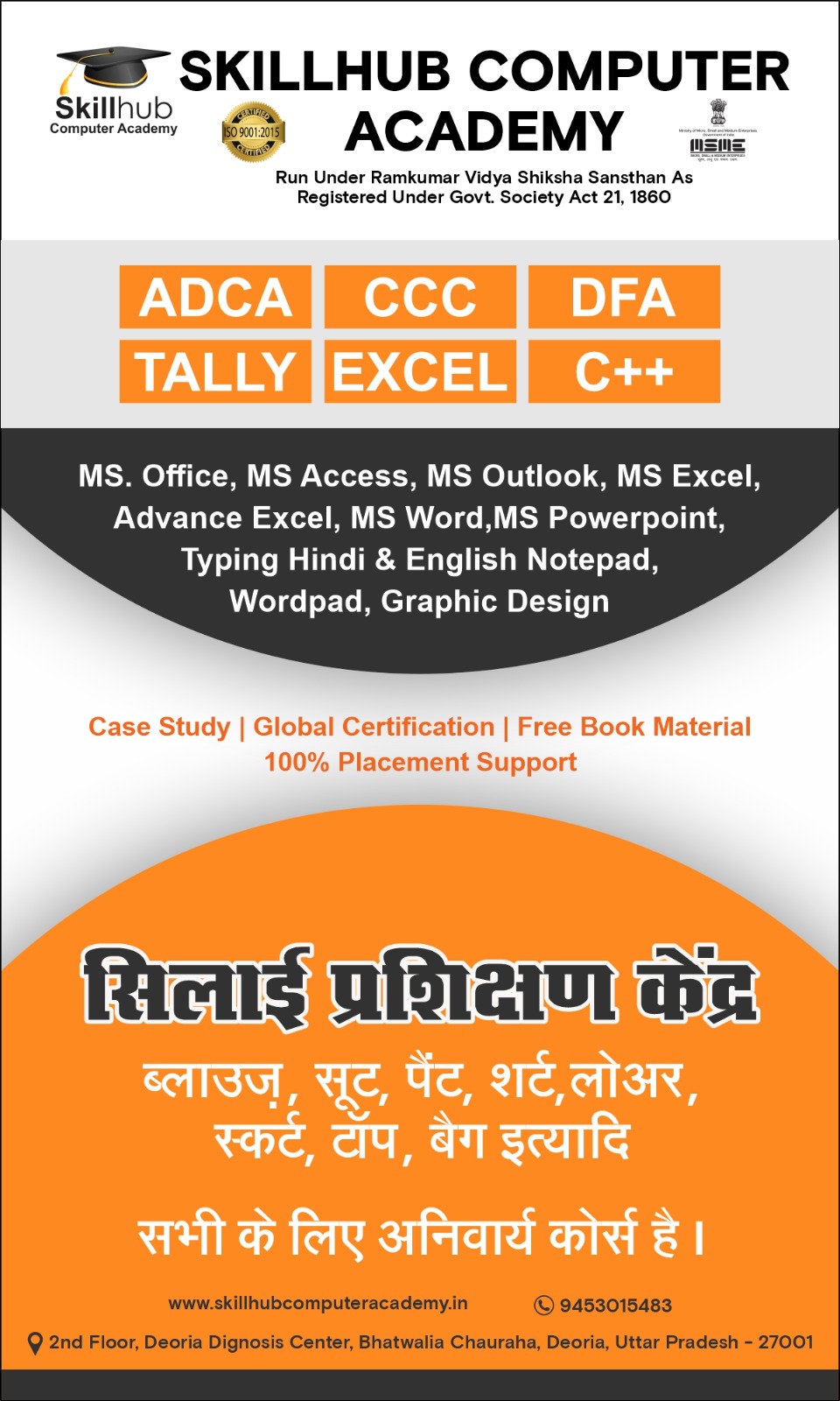 We are proudly registered under the Government of India, ISO 9001:2015 certified, and recognized by MSME. Our mission is to empower students with essential IT skills and practical knowledge for a successful career. Our vision is to build a digitally skilled generation that can contribute to the nation’s progress. At SkillHub, students enjoy state-of-the-art computer labs, experienced faculty, and regular practical sessions. We offer government-registered certifications that add value to your resume. Our courses are job-oriented and designed to build a strong professional foundation. We also provide flexible class timings, affordable fees, and personalized attention to each student. Join SkillHub Computer Academy and unlock your potential with the best learning environment and assured skill development.
